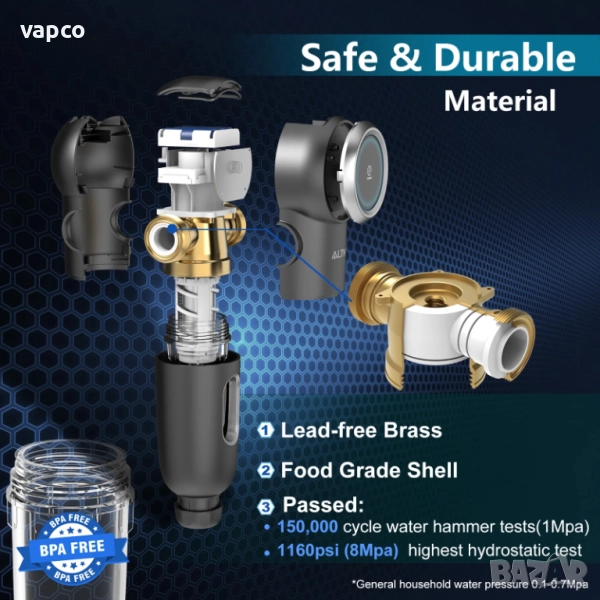 - Материал: корпус без BPA, произведен в Германия, месинг без олово, филтър от неръждаема стомана SUS 316L