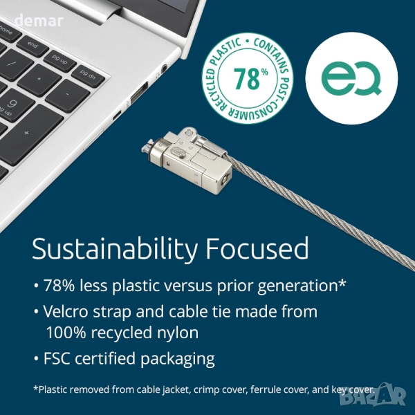 Изработена със 78% по-малко пластмаса и FSC сертифицирана опаковка, тази ключалка е с издръжлив 1,8-метров кабел от неръждаема стомана, проектиран да устои на срязване и да закрепва лаптопи към неподвижни предмети. Тънката ѝ нано глава е подходяща за ултратънки устройства, без да блокира портове, като ги държи стабилни по време на употреба. Прецизно проектирана за здравина и тествана срещу кражба, тя се предлага с 5-милиметрова система за заключване за надеждна защита.
