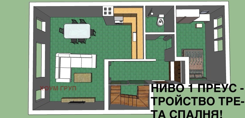 РАЗПРЕДЕЛЕНИЕ/ВИЖ ПРОЕКТИ В СНИМКИ!/: Две нива по 75 кв.м., КОЕТО ПОЗВОЛЯВА РАЗЛИЧНИ РАЗПРЕДЕЛЕНИЯ! Апартаментът и бил и ЛЕСНО МОЖЕ ДА СЕ ПРЕУСТРОИ ОТНОВО с ТРИ ПРОСТОРНИ СПАЛНИ, ИЛИ НА ДВА ДВУСТАЙНИ С ОТДЕЛНИ ВХОДОВЕ! Разпределението се вижда в снимки, на вторият етаж има гардеробна и връзка от втория етаж към таванското!
