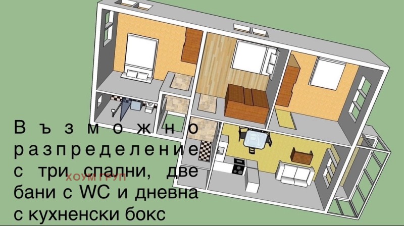 РАЗПРЕДЕЛЕНИЕ: ВИЖ В СНИМКИ, ВЪЗМОЖНОТО ПРЕУСТРОЙСТВО Е В ДВА РАЗЛИЧНИ ЦВЯТА, ЗА ВСЕКИ АПАРТАМЕНТ! Апартаментът е с четири големи, самостоятелни помещения, баня с тоалетна и обособено място за втора баня с тоалетна.