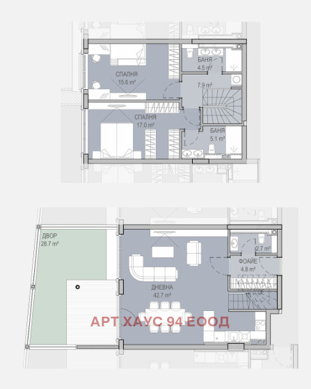 - I НИВО - голямо фоайе (4,8 кв.м), дневна с кухня (42,7 кв.м), тоалетна, ДВОР/ТЕРАСА (28,7 кв.м)
