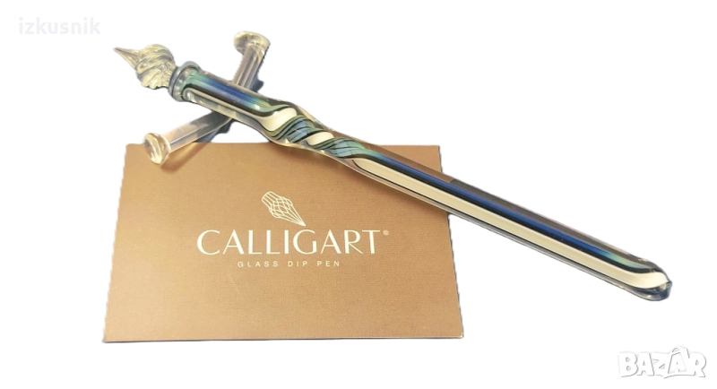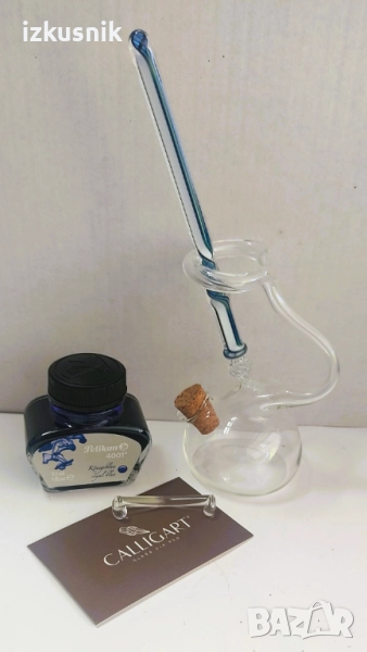 Много красив и изящен комплект от стъклена писалка, подложка и мастилница с известната марка CALLIGART. Ръчно изработени в Турция от стъкло Тюрингер Валд, Германия и Мурано, Венеция, Италия. В комплекта - и флакон мастило Pelikan. Нищо от съдържанието не е използвано, комплектът е нов, в оригинална кутия и с етикет за автентичност. Писалката е модел Wave /Вълна/, наречен така