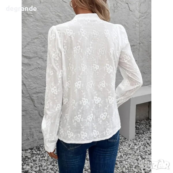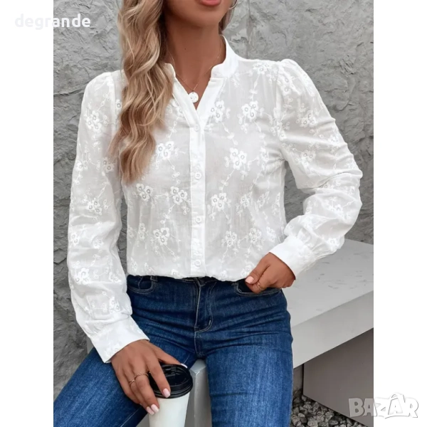 дамска памучна риза с бродерия, висока яка и копчета