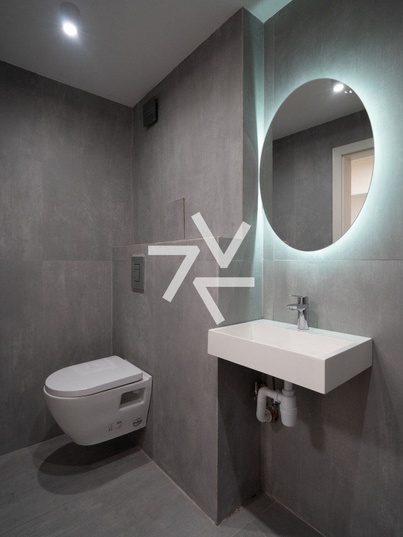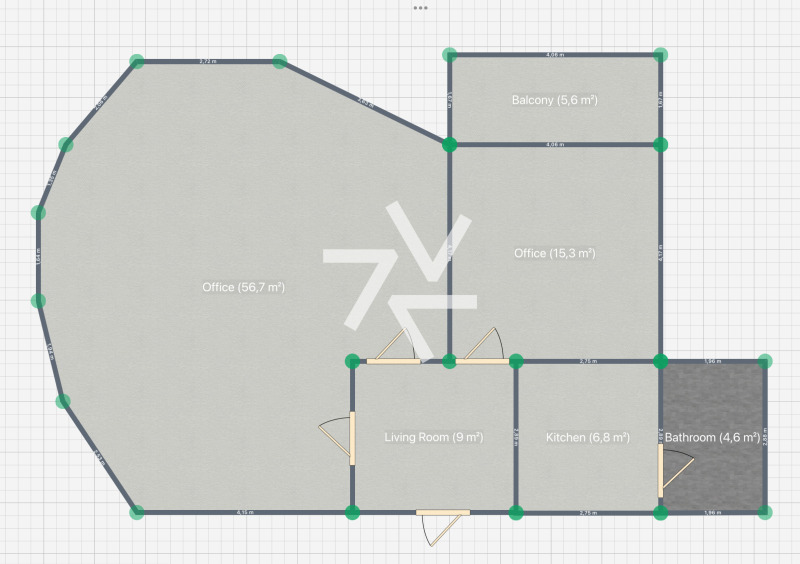 коридор, зала (офис), кабинет, кухня, балкон и баня с тоалетна