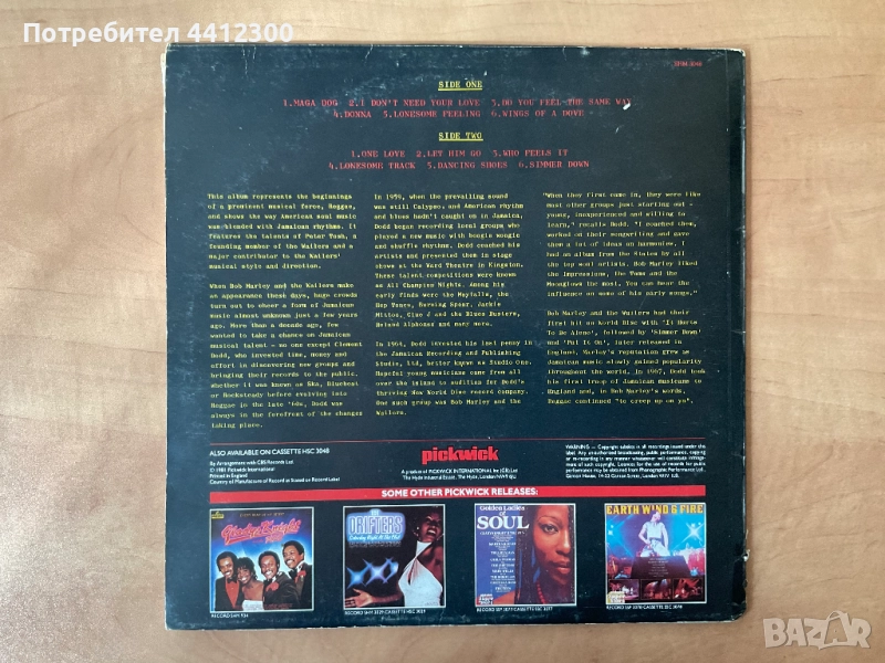 Здравейте, грамофонна плоча 12 инча Bob Marley and The wailers with Peter Tosh. Английско издание. Не нося отговорност за състоянието на плочите, не почиствам плочи, ако имате въпроси, може да ми звънете на посочения номер или да ми напишете съобщение. Отговарям след 18 часа, цените не се коментират, ако не се вземат повече от 10 плочи. Благодаря, че прегледахте обявата ми. Лек и спокоен ден!