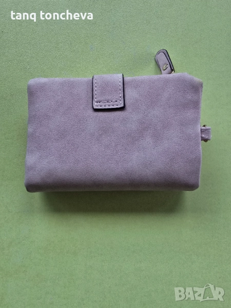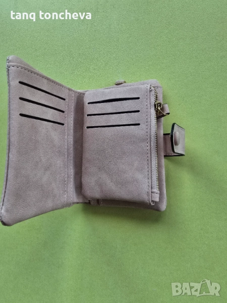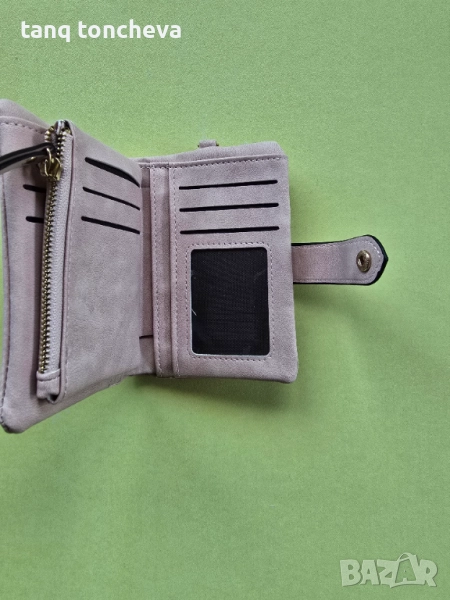 Портмонето е чисто ново от промазан велур в цвят светло розово на снимките не се вижда много добре. Меко е, има една преграда за банкноти и втора с цип. Много отделения за карти и малки прегради, както и отделение за монети с цип. Размери д.13 в.9