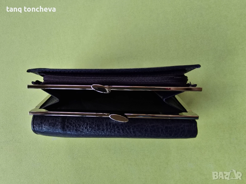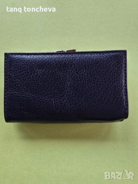 Портмонето е тъмно лилаво, на снимките изглежда черно. Естествена мека кожа, компактно, с две прегради за банкноти, плюс една допълнителна с цип. Има прегради за съхранение и за карти, с два монетника - единия с цип, а другият с механизъм. Размери д.14 в.8