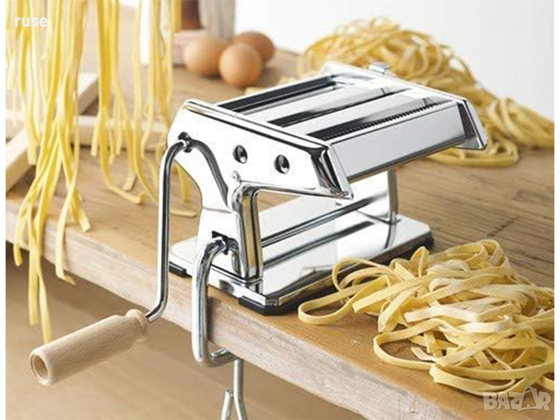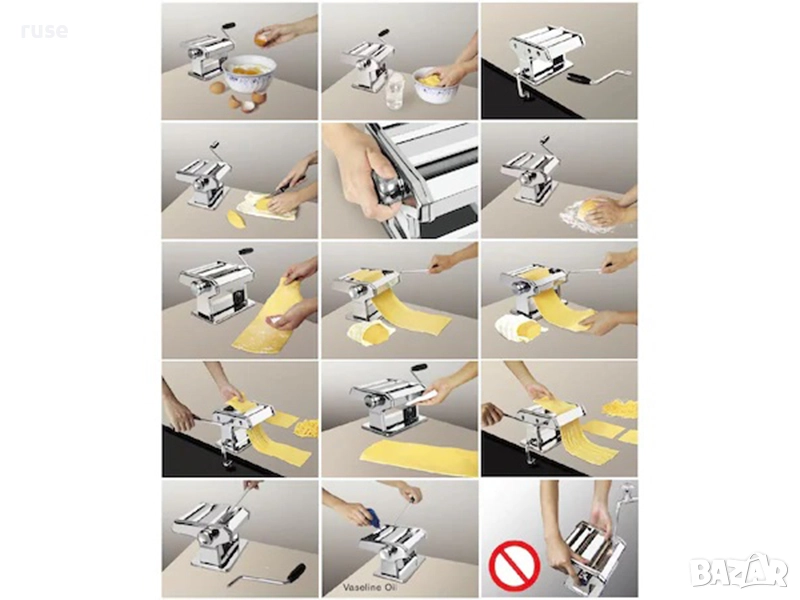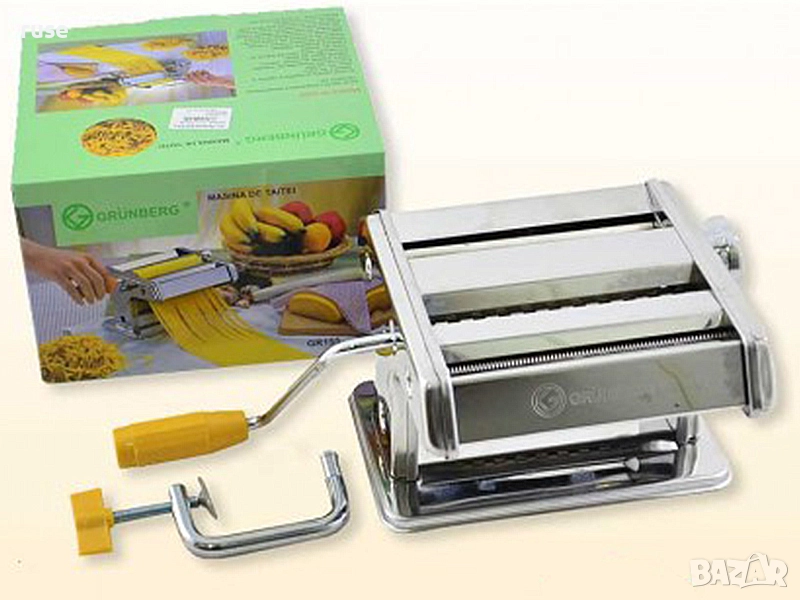 Grunberg GR155 е идеална за бързо приготвяне на домашна паста и включва регулируем валяк с ширина до 150 мм, устройство за разтягане на тесто, 2 форми (юфка и спагети - лазаня, фетучини, талиолини), устройство за фиксиране на маса и дръжка/манивела/.