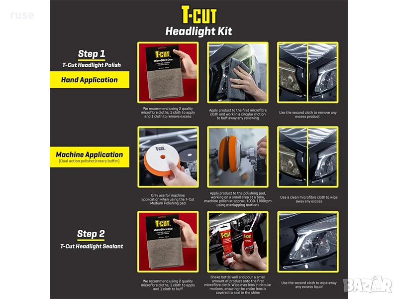 - Специално проектиран за да подновява замъглени, надраскани и жълти фарове, правейки ги като нови с кристален завършек