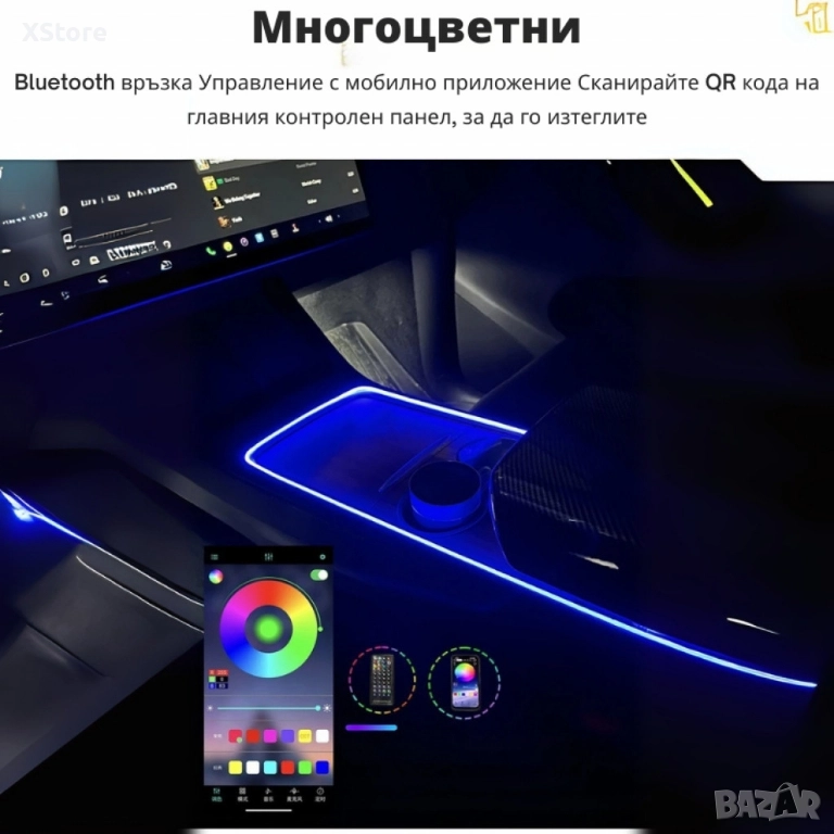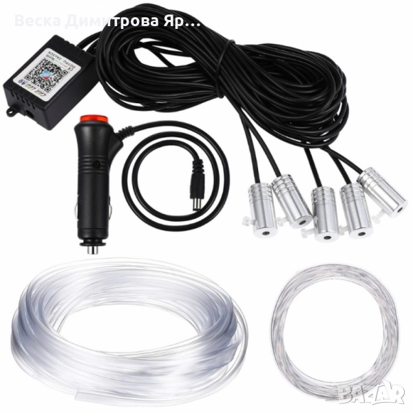 RGB осветление с над 16 милиона цвята; Музикален режим (реагира на звук); Управление на яркостта и режимите на светене; Bluetooth връзка с Android/iOS приложение; Интелигентен чип с защита от прегряване; Лесен монтаж, без разглобяване на интериора; Материал: Алуминиеви LED капсули и гъвкави оптични влакна; Дължина на влакната: 6 метра; Захранване: 12V – директно в запалката на автомобила; Съвместимост: Подходящо за всички марки и модели автомобили; Управление: Чрез мобилно приложение (QR код за изтегляне от контролера); Цвят на светене: RGB – сменяеми цветове (червено, синьо, зелено, лилаво, жълто и др.).
