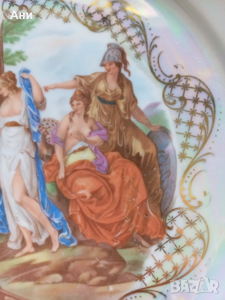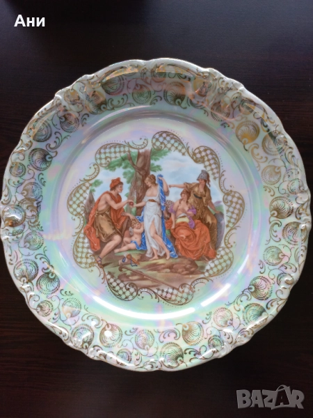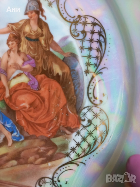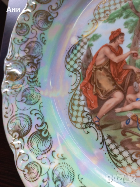 Предлагам изключително красива декоративна порцеланова чиния, произведена в Германия (вероятно Winterling, Бавария), около 1955–1970 г. Изработена е от фин порцелан, с перлен люстре ефект и ръчно положена позлата по ръба. Централният мотив изобразява митологична сцена с амур и класически фигури – елегантен детайл за колекционери или декорация на интериора