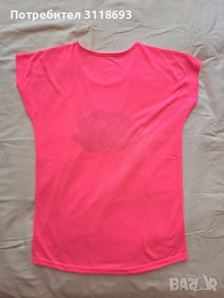 Продавам дамска тениска с къс ръкав. Цветът е неоново розово и е напълно запазен, без избледняване. Материята е много мека. Има много готини пайети отпред, които придават особен чар на цялата тениска.