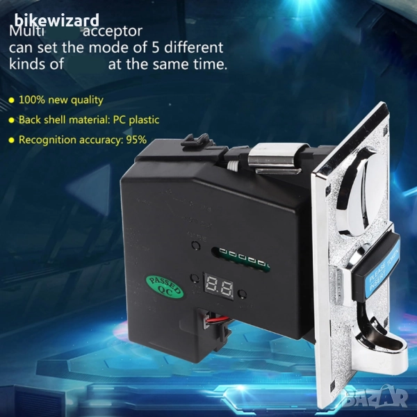 Идентифицира истинска или фалшива монета според материала, диаметъра и дебелината на МОНЕТАТА, с висока точност. Диаметърът на монетите е 0.59-1.14 инча, а дебелината на монетите е 0.07-0.12 инча. Приема 6 различни вида монети едновременно, контрол на процесора, автоматично запомня набора от примерни МОНЕТИ. Може да се използва в игрални машини, вендинг машини, телефони с монети, перални машини с монети, колички за играчки с монети, масажни столове и др.