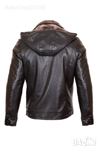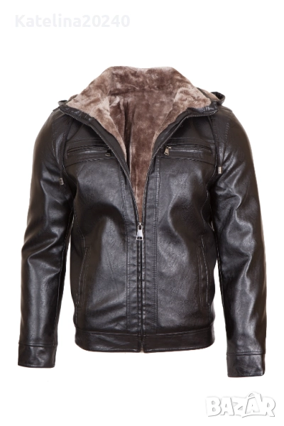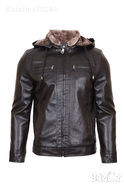 Мъжко якe от висококачествена еко кожа с качулка, която се сваля. Вътрешната част е изработена от пресована вата и каракул, което го прави изключително подходящо за студените дни. Същевременно е много леко и удобно. Разполага с два външни, два джоба с цип в горната част и един вътрешен джоб.