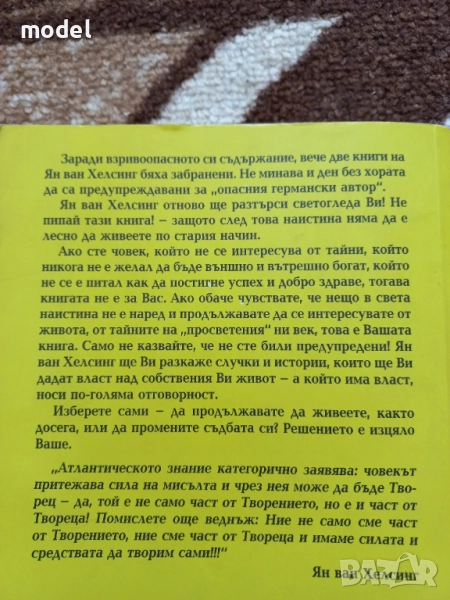 Ако сте човек, който не се интересува от тайни, който никога не е желал да бъде външно и вътрешно богат, който не се е питал как да постигне успех и добро здраве, тогава книгата не е за Вас. Ако обаче чувствате, че нещо в света наистина не е наред и продължавате да се интересувате от живота, от тайните на "просветения" ни век, това е Вашата книга. Само не казвайте, че не сте били предупредени! Ян ван Хелсинг ще Ви разкаже случки и истории, които ще Ви дадат власт над собствения Ви живот - а който има власт, носи по-голяма отговорност.