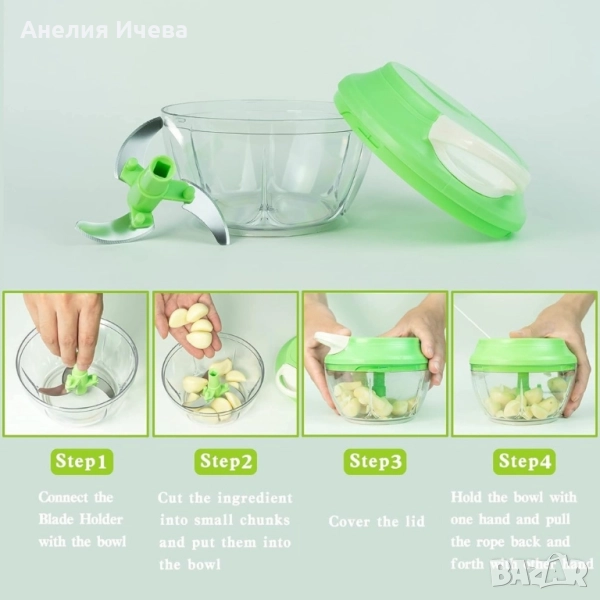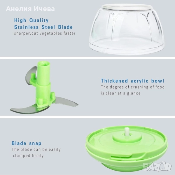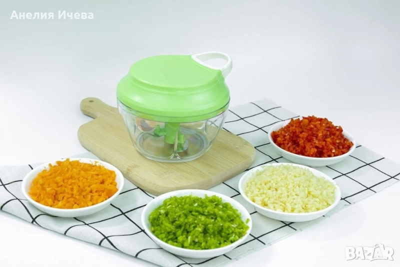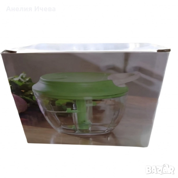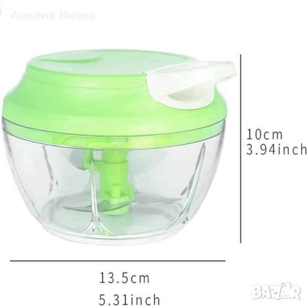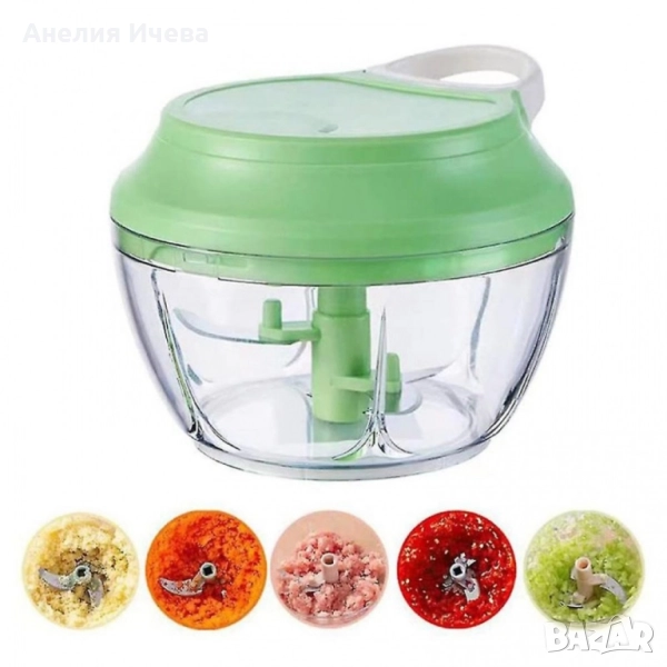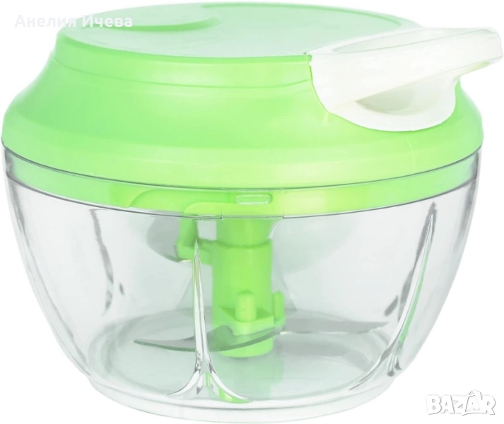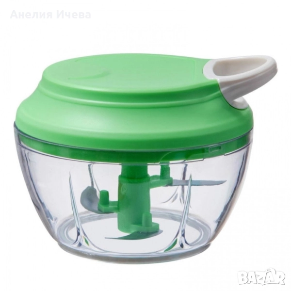 Чопърът за зеленчуци е истинска находка за всеки, който иска да готви вкусни ястия, но не иска да губи време. От билки и лук до яйца и галета, този ефективен уред за зеленчуци може буквално да смеси и пасира всичко за секунди. Чопърът не изисква електричество - мощното ръчно задвижване ви позволява бързо и лесно да нарежете храна не само у дома, но и сред природата. Здравият и ефективен механизъм осигурява високо качество и скорост на нарязване. Материали: корпус пластмаса, капак пластмаса, капацитет 450 мл., ножчета от неръждаема стомана, мощност 50W, размери с дължина 13,5 см. и височина от 10 см., прозрачна купа, капак в зелен цвят с бяло.