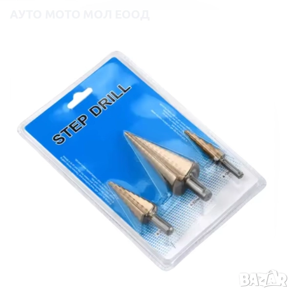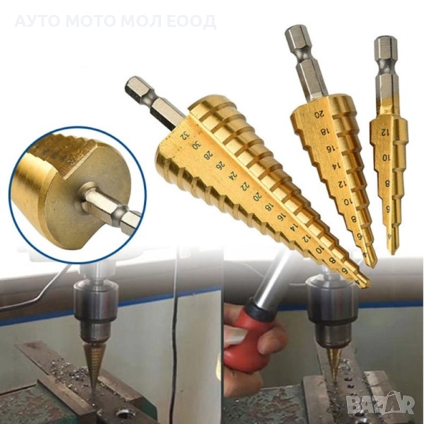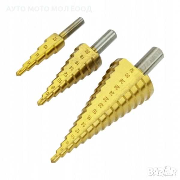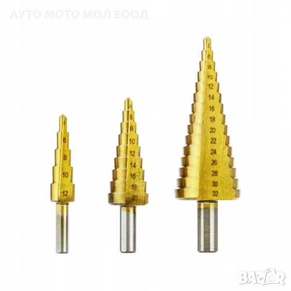 Комплекта конусовидни свредла е съставен от 3 части с размер Ø 4 - 32 мм. Предназначени са за пробиване в строителна и студено валцована стомана, цветни метали, стоманени листове, пластмаси, дърво и т.н. Изработени са от високоскоростна стомана HSS, покрита с титаниев нитрид. Работният диаметър на свредлото нараства от върха към опашката в стъпаловиден профил.