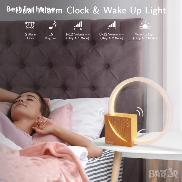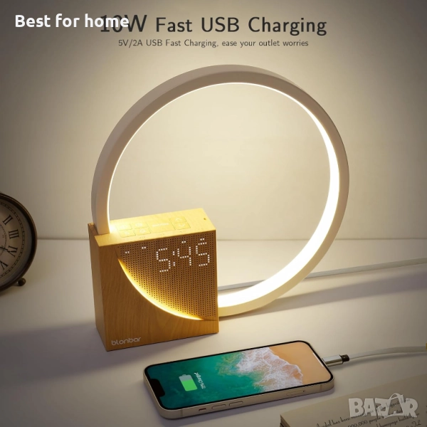 ПРОСТ И СТИЛЕН ДИЗАЙН: Настолна лампа с бързо зареждане от USB 5V/2A, светлина за събуждане, 2 будилника, 10-минутно отлагане, 4-степенно затъмняване, успокояващ звук и обратно броене, за да поддържате работния си плот/нощното си шкафче подредено. Висококачествен материал, модният дизайн с дървесни шарки е красив, подходящ за декорация на спалня, хол и навсякъде другаде.