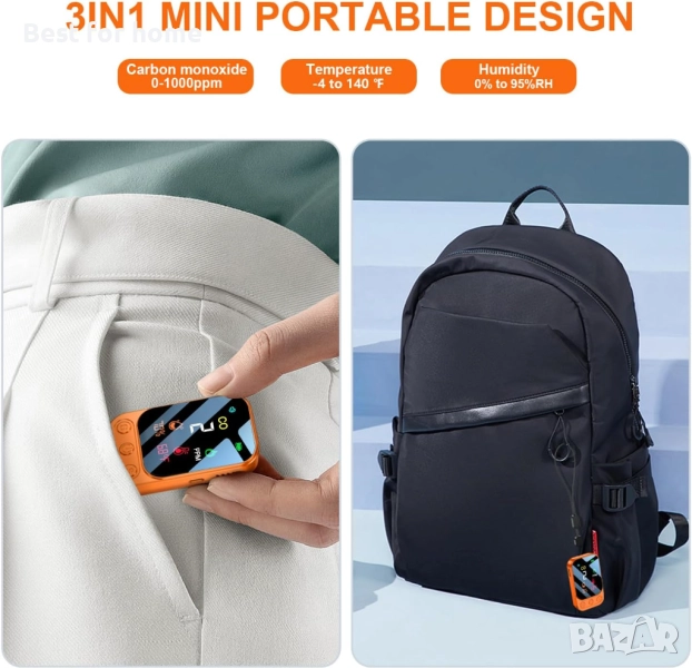 【3 в 1 CO детектори】Монитори за въглероден оксид, влажност и температура, всички интегрирани в миниатюрно тяло на детектора с размери 3,5x2,2x0,66 инча, проследяват в реално време концентрацията на вредни газове, влажността и температурата и ги показват на HD екрана.