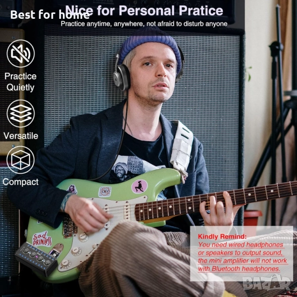 Изход за слушалки за тиха практика -Нашият усилвател за слушалки за китара е удобно устройство за тихо свирене за китаристи. Няма повече притеснения, че ще безпокоите другите, а ви позволява да свирите с любимите си парчета или да се забавлявате с музикални идеи до късно през нощта!