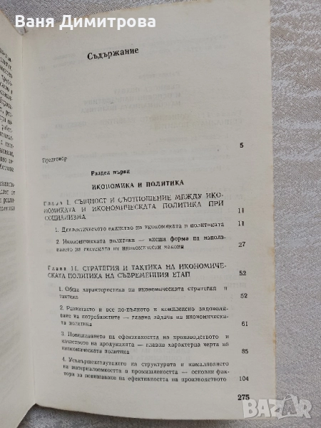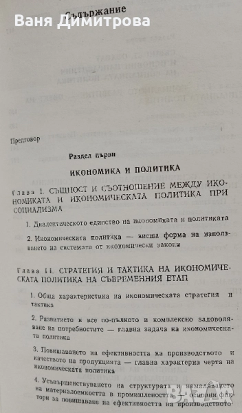 В книгата се разглеждат теоретически, методологически и практически проблеми на икономическата и социалната политика. На основата на марксистко-ленинското учение и на опита на нашата партия, на КПСС и на други братски партии се разкриват специфичните черти, цели и задачи на икономическата политика в социалистическото общество; правят се изводи за понататъшното усъвършенствуване на политическото ръководство и управление на икономическото развитие в етапа на изграждането на зрелия социализъм. Особено внимание се отделя на повишаването на ефективността на общественото производство и на качеството на продуктите на труда като основни лостове за реализирането на висшата цел на икономическата политика.