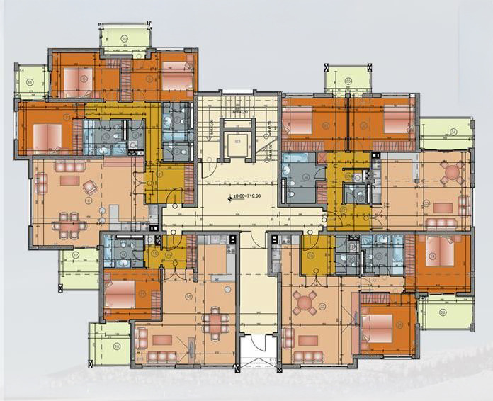 Четиристаен непреходен апартамент в малка компактна сграда с три спални, две бани с тоалетни, самостоятелна тоалетна и просторна дневна, три балкона, просторно входно антре.