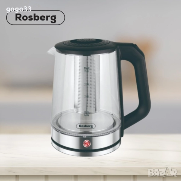 Електрическа стъклена кана с филтър от неръждаема стомана Rosberg, 1500W,2L, 2 ГОДИНИ ГАРАНЦИЯ Цена: 45 лева Мощност: 1500W; Вместимост: 2 литра; Материал: Стъкло; Цвят: Черен; Вграден нагревател от неръждаема стомана; Автоматично изключване при кипване на водата; Защита от извиране на водата; Бутон за Вкл./Изкл.; Светлинен индикатор; Захранване: 220-240V~ 50-60Hz; Гаранция: 24 месеца.