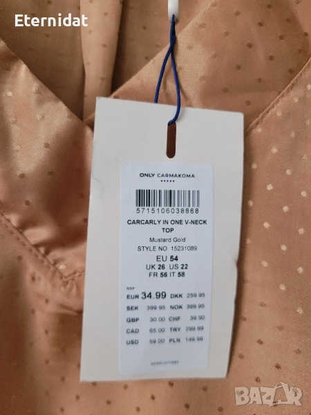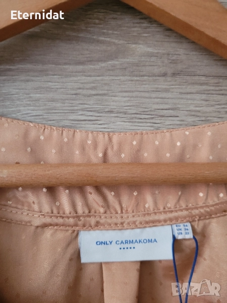 Нова с етикет оригинална елегантна блузка ONLY CARMACOMA. Много нежна материя на точки в страхотен цвят! За повод, за офис или за ежедневието. Лека, супер удобна, стои страхотно! Стои свободно, без ограничения в раменете. Дълга 75см, в гръдната се носи свободно падаща ( 140см от край до край). EU 54 ( перфектна от ХЛ до 3ХЛ ) Цена на етикета 35 EUR ( 68лв) Моята е 37лв