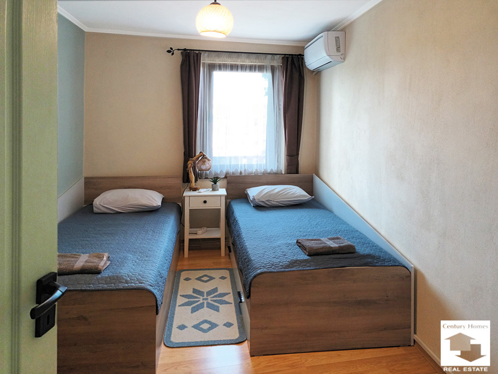 Двете уютни спални са елегантно обзаведени съответно с двойно в едната и две единични легла в другата, както и с тоалетки и гардероби. Апартаментът включва също баня с тоалетна и отделна втора тоалетна, осигуряващи достатъчно удобство.