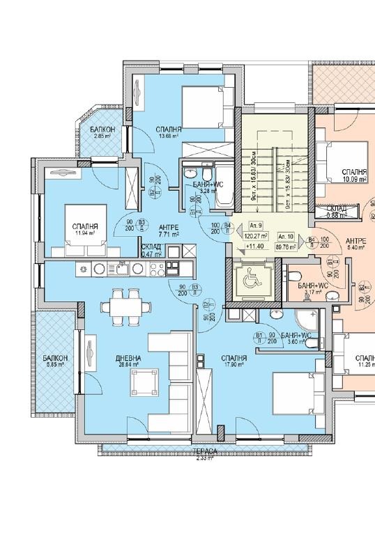 Разпределение: входно антре, кухненски бокс с хол и трапезария, три спални, две бани с тоалетна, складово помещение и две тераси