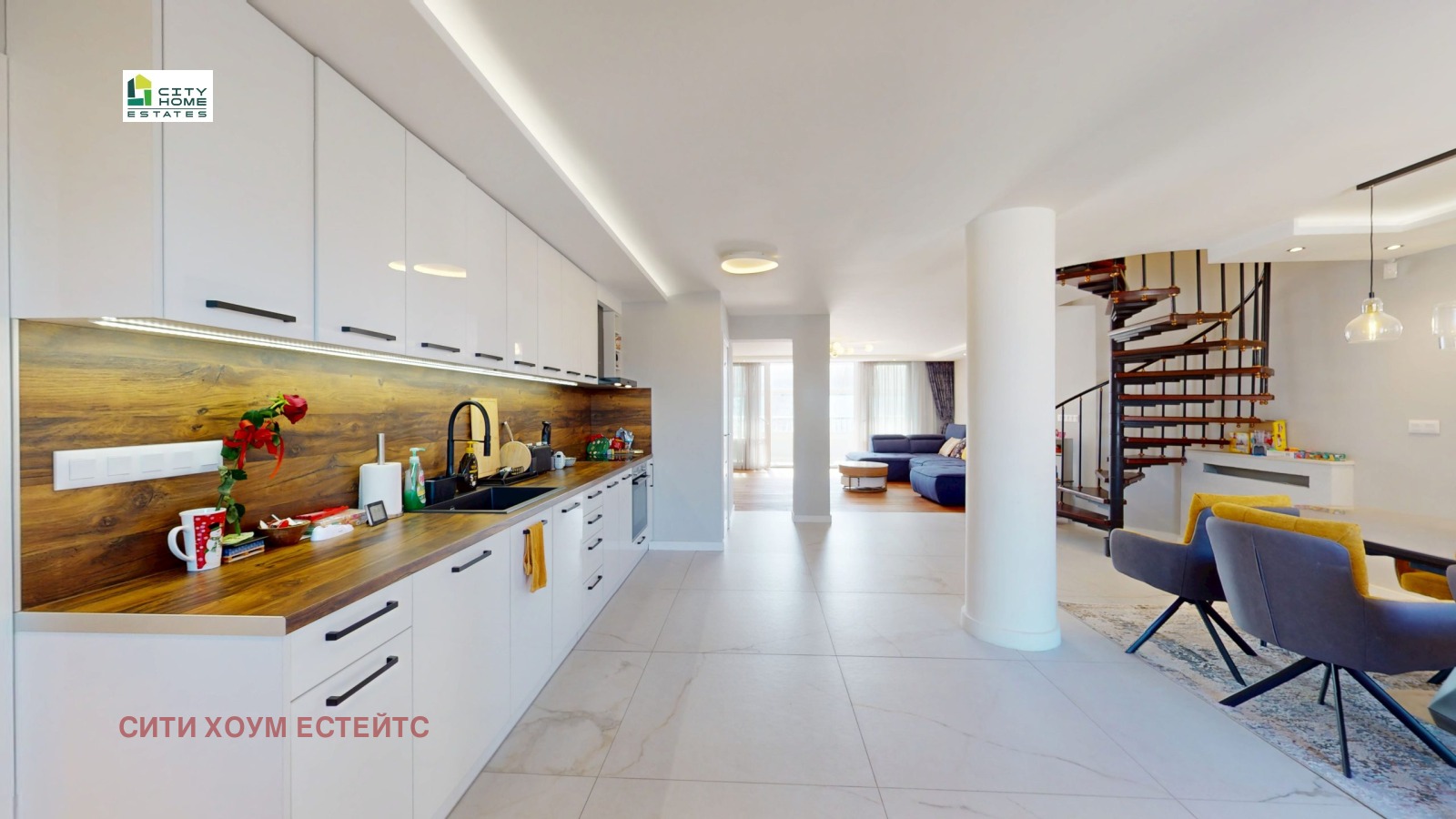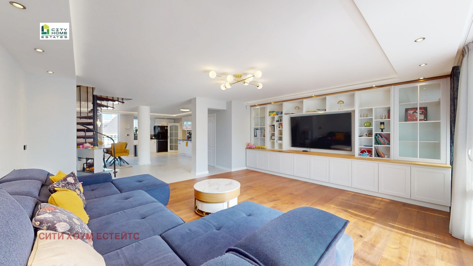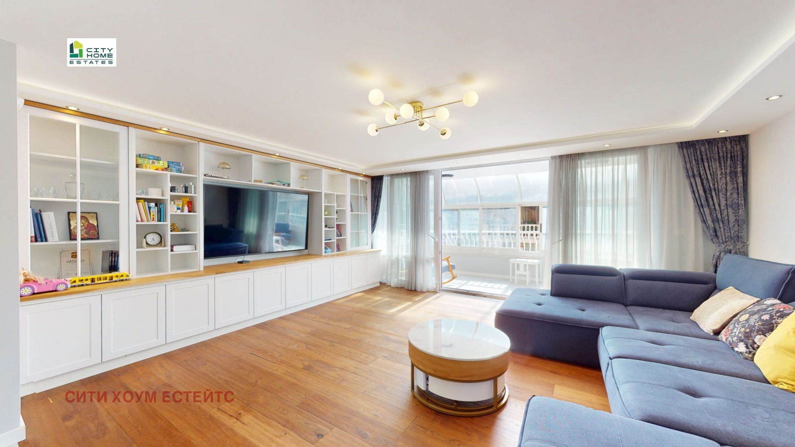 Жилището разполага с няколко тераси, една от които е остъклена и е идеална за зимна градина, сутрешно кафе или спокоен работен кът. Подовите настилки са от естествен паркет и гранитогрес, а интериорът е подбран с внимание към детайла и висок стандарт на изпълнение.