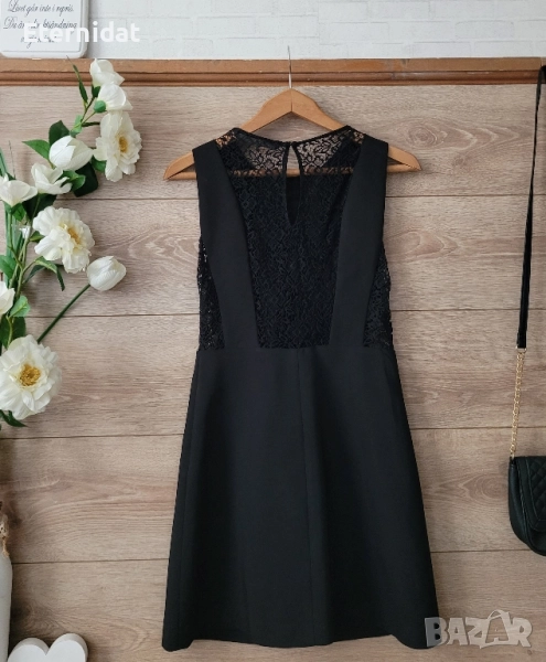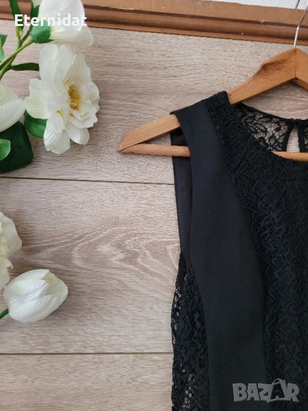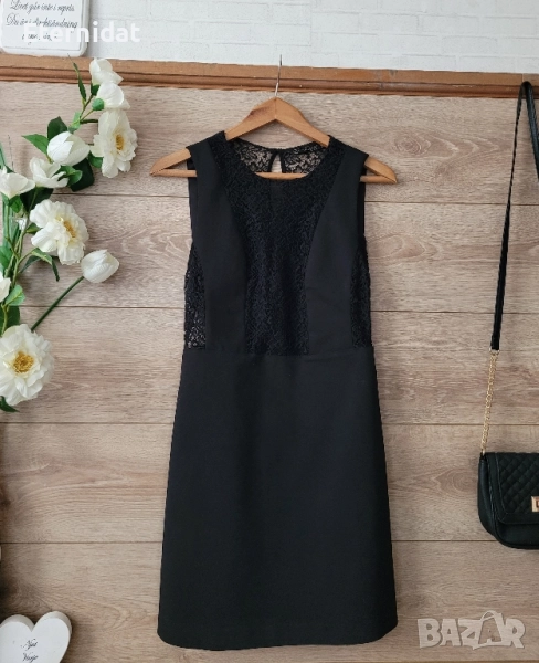 Елегантна стилна черна рокля ZARA. Размер S Страничен скрит цип, дантела, при бюста е подплатена не прозира. Ефектен гръб. За офис, за повод или вечерна. Стои страхотно! Има цялостна еластичност. Дълга 80см, гръдна 40-44см ( едностранно измерена), талия 34-36см ( едностранно). Цена 37лв