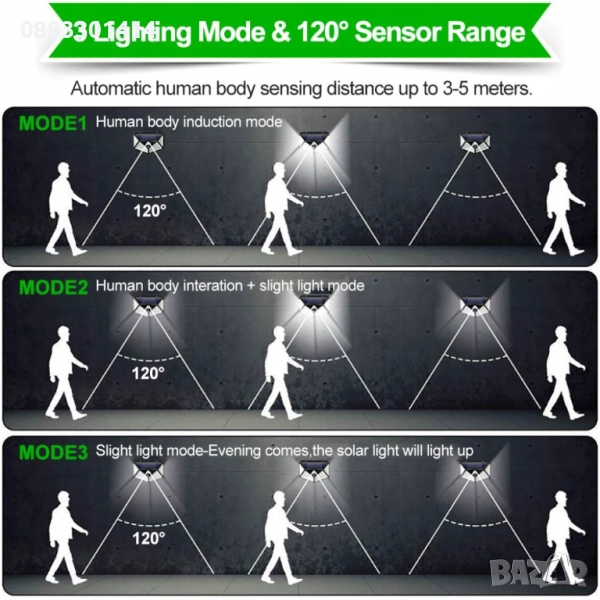 Водоустойчива външна соларна лампа с 300 LED диода - 3 режима на работа. Датчик за движение + сигнална светлина при наличие на такава. Как работи? - При движение светва в силно за 15-20 секунди, а ако е нощ свети в stand by режим.