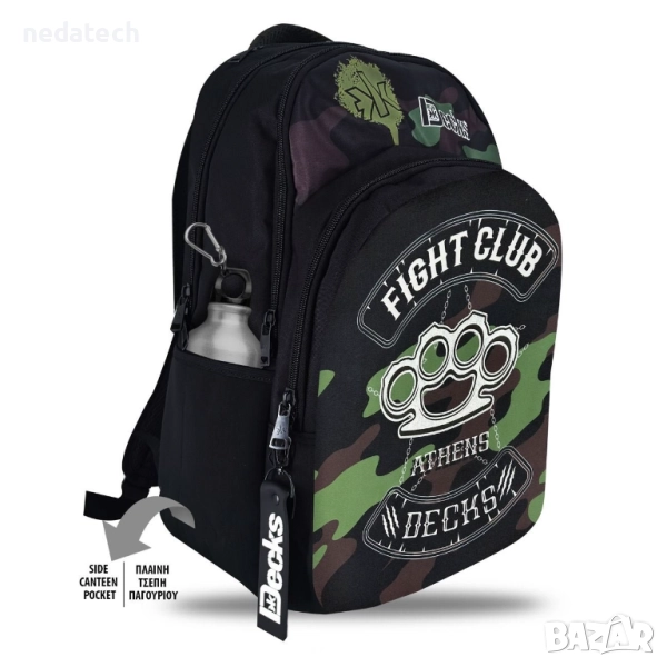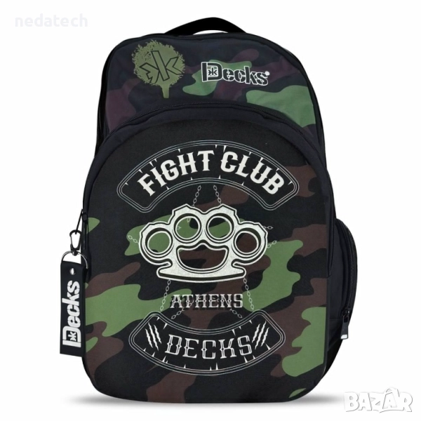 Ученическа раница в черно и каки с армейски дизайн, железен юмрук и щампа "Fight Club". Разполага с 2 големи и 1 малък джоб, джоб с цип и страничен джоб с неопренова подплата, мек анатомичен гръб, джоб за лаптоп, органайзер, калъф за очила, черен ключодържател и светлоотразителни ленти. Идеална за ученици от началното училище и тийнейджъри.
