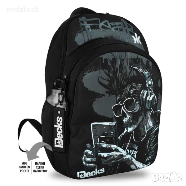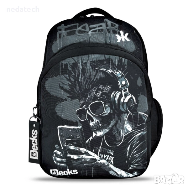 Ученическа раница в черно и сиво с дизайн на череп със слушалки, бандана, слънчеви очила и мобилен телефон и принт "Страх". Разполага с 2 големи и 1 малко отделения, отделение с цип и странично отделение с неопренова подплата, мек анатомичен гръб, отделение за лаптоп, органайзер, калъф за очила, черен ключодържател и светлоотразителни ленти. Идеална за ученици от началното училище и тийнейджъри.