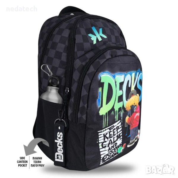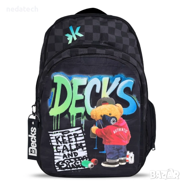 Ученическа раница в черно с дизайн на плюшено мече с графити и принт "Keep calm and spray". Разполага с 2 големи отделения, едното с отделение за лаптоп и 1 малко с органайзер, отделение с цип и странично отделение с неопренова подплата, мек анатомичен гръб, отделение за очила, черен ключодържател и светлоотразителни ленти. Идеална за ученици от началното училище и тийнейджъри.