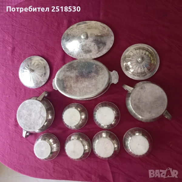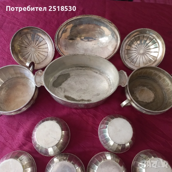 Старинен комплект посребрени съдове на известната Berndorf,по данни за маркировка са произведени в периода 1891-1927 години.Нормални следи от употреба за годините си,не са почиствани.Съдовете са дебелостенни,общо тегло около 5 кг.Страхотни за украса и колекции.Всеки един съд е маркиран.Не се делят,рядко срещан комплект,няма подобен на пазара.