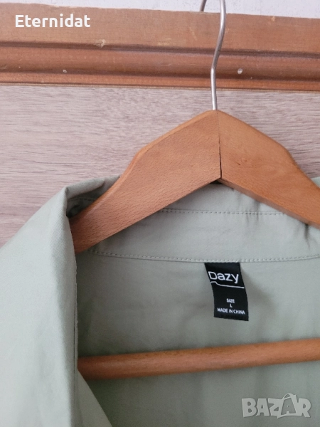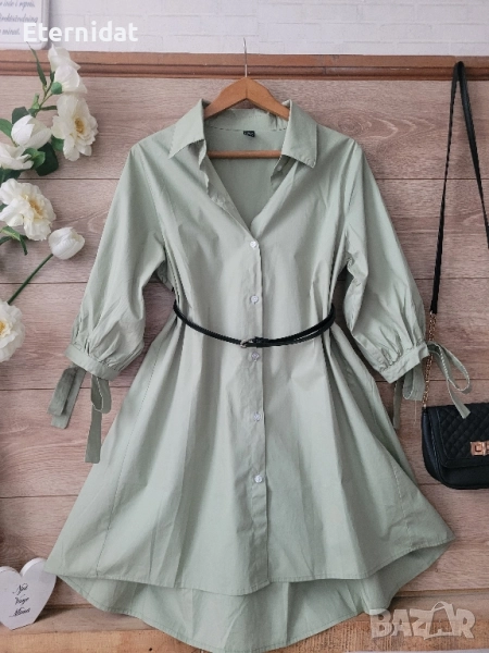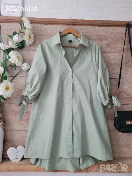 Нова страхотна кройка и дизайн риза/ туника или рокля DAZY. Светло зелен цвят, ефектен гръб и ръкави, цялостно предно закопчаване копчета. За офис, за повод или за ежедневието с кецове и дънки. Размер Л. Дълга отпред 80см, отзад 88см. Гръдна 100см Цена 45лв
