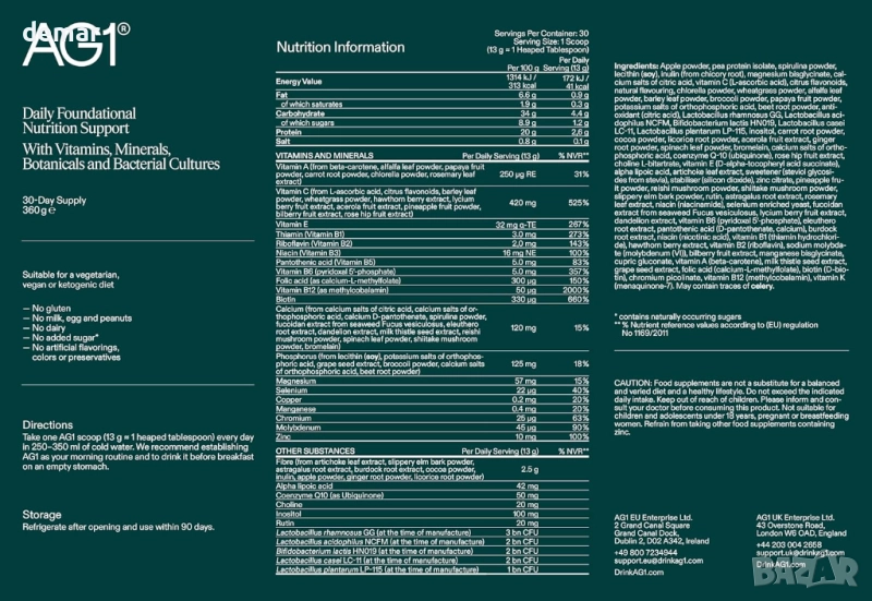 Хранителна добавка AG1 Greens на прах | Дневен прием на хранителни вещества