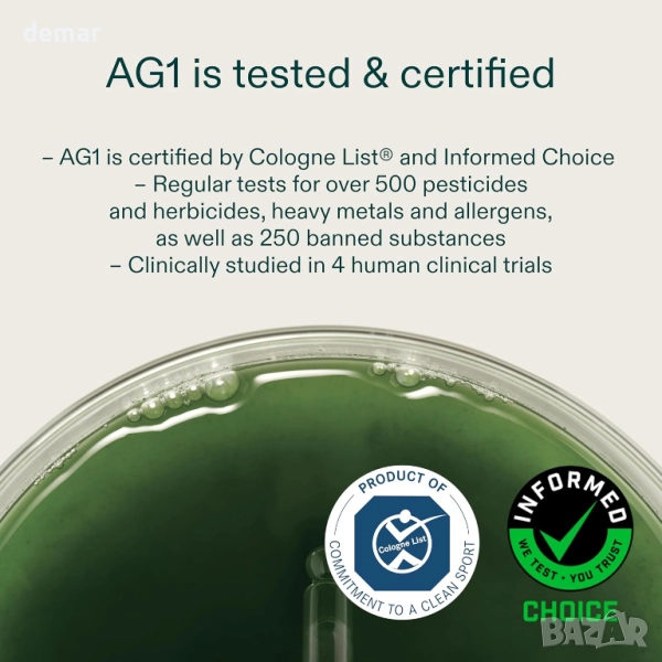 AG1 е ежедневна хранителна добавка, комбинираща витамини, минерали, пробиотици и растителни съставки в една лъжичка, за да подпомогне храносмилането, енергията и имунитета. Подходяща за възрастни над 18 години, тя е подходяща за широк спектър от диети, включително веган, кето и палео, без глутен, млечни продукти, яйца, фъстъци, ГМО, изкуствени добавки или добавена захар. Подкрепена от четири клинични изпитвания и строги тестове от трети страни за замърсители, алергени, пестициди и забранени вещества, тя гарантира висока безопасност и качество. Тази торбичка осигурява месечен запас и е с лек вкус на ананас и ванилия.