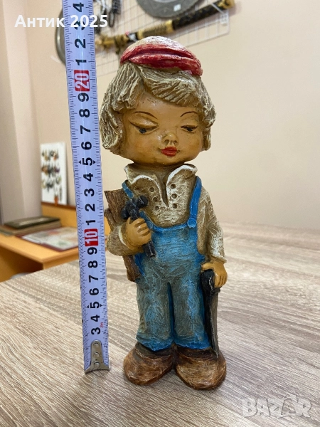 Тази очарователна винтирана статуетка изобразява момче, облечено в син работен гащеризон и червена шапка. Фигурката е изработена от полистоун – здрав и дълготраен материал, който отлично предава детайлите. Височината на статуетката е около 22 см. Тя е идеална декорация за интериор в ретро или провансалски стил. Чудесен подарък за колекционери и ценители на винтидж предмети.