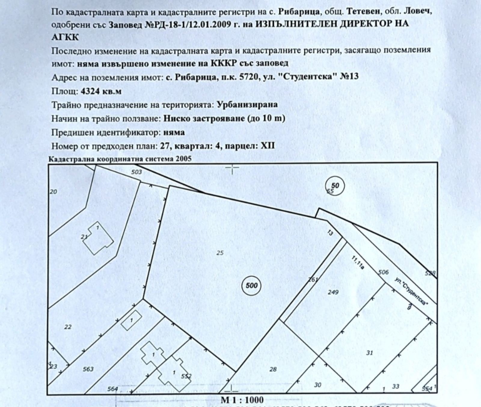 Предлагаме за продажба отличен поземлен имот с площ от 4325 кв.м, разположен в село Рибарица в близост до Тетевен, Рибарица предлага живописна природа и чист въздух, което я прави привлекателна за любителите на спокойствието.