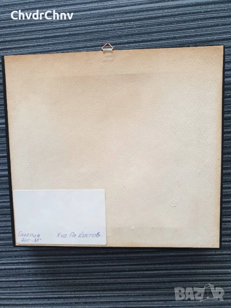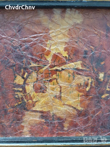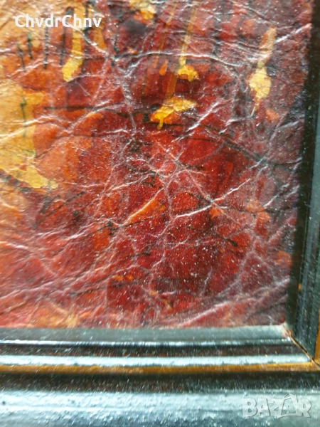 Техника акрилни бои върху картон (ефект кракле), дървена рамка, отлично състояние (бои, рамка), изобразена е улица със стари/възрожденски къщи и дървета.