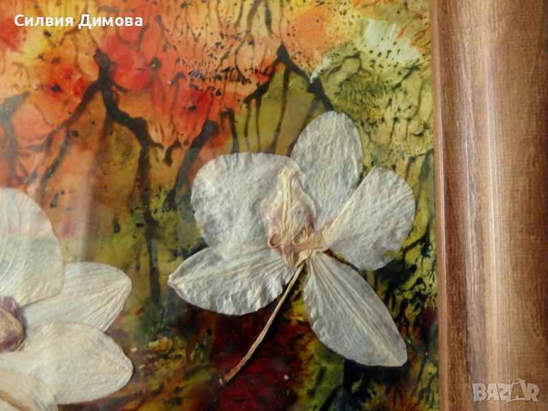 Орхидеите са изсушени и аранжирани върху фон с маслени бои. Лакирани са и има предпазно стъкло.Подходящ подарък за дами или за уют в дома.Размерите с рамката са: ширина 28см, височина 23см, дебелина 2,5см. Подходящ подарък за дами или за уют в дома.
