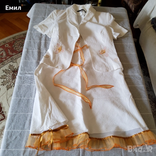 Продавам бял дамски костюм. Размер 44. Носен 2-3 пъти. Полата е с подплата. Цена 45 лв.
