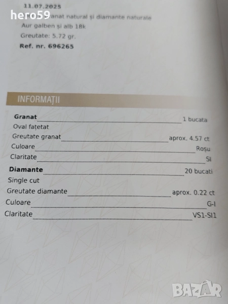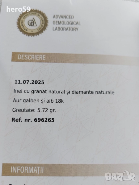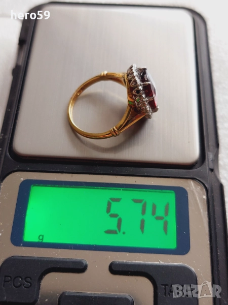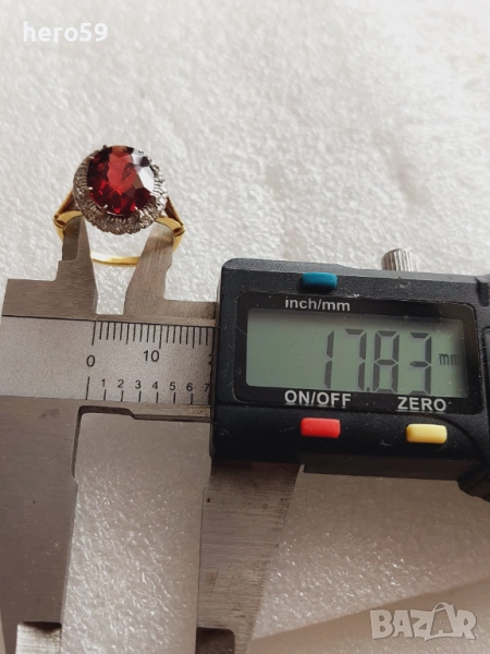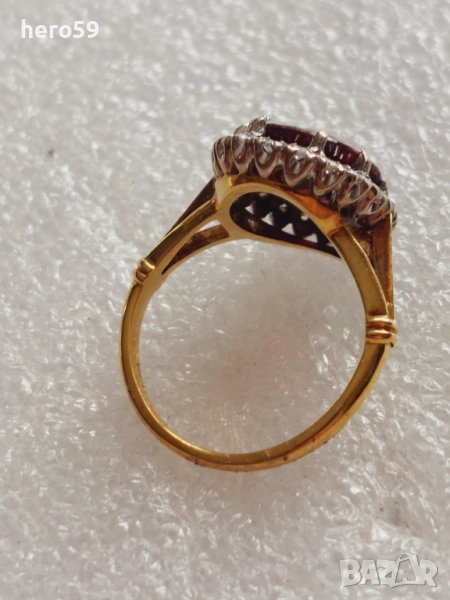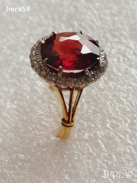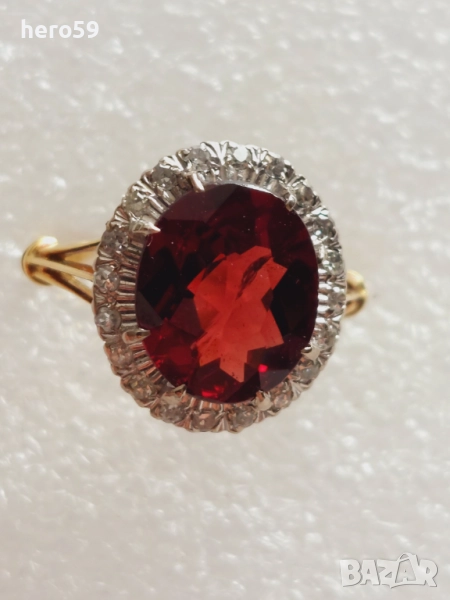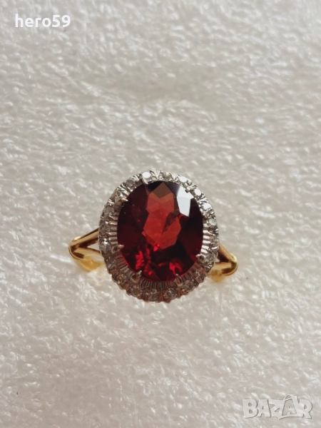 Съвременен дамски златен пръстен 18к с прекрасен гранат и диаманти.Има и сертификат → Обява 51484845