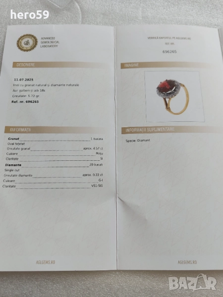 Предлагам за продажба дамски златен пръстен 18к с инкрустиран гранат и диаманти,с приежащ сертификат.