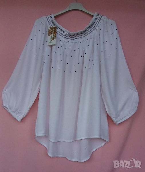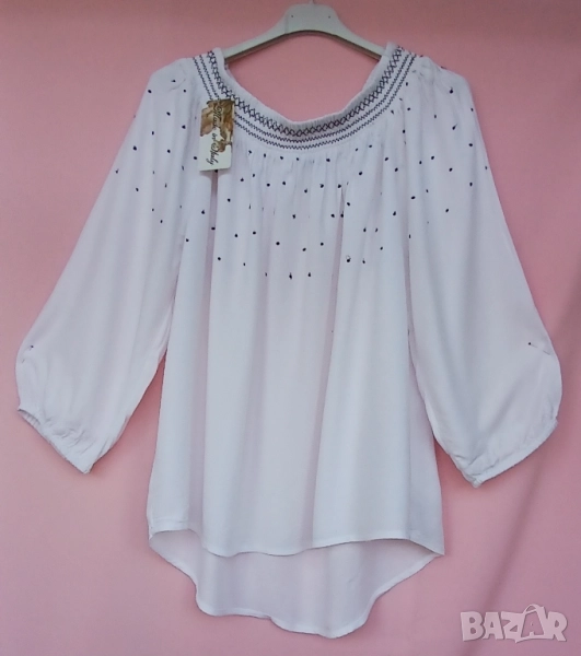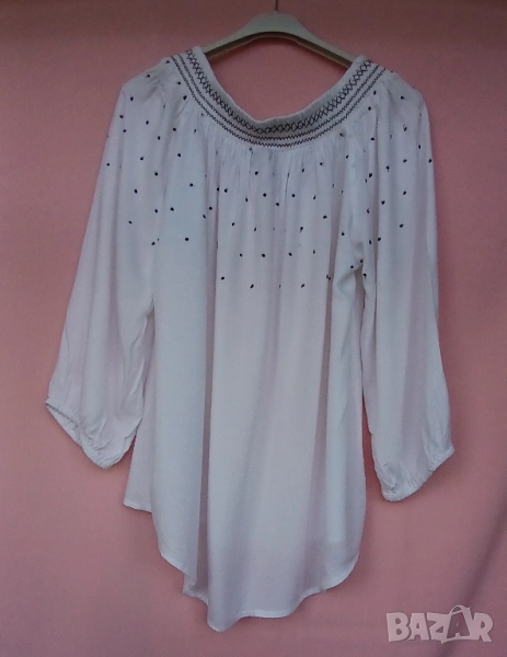 4. Памучна блуза с лодка деколте и бродирани орнаменти в черно , около деколтето и в горната част на блузата и ръкавите. Размер 42. Марка Yessica. Обиколка на гърдите 130 см, дължина на блузата в предна част е 62 см, а дължина на гръб на блузата 73 см. Цена 25 лв.
