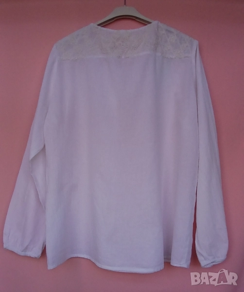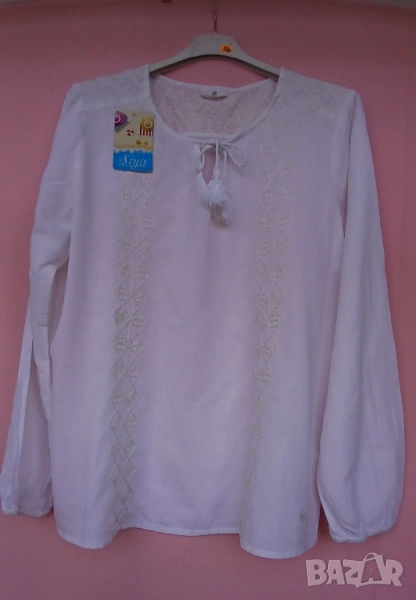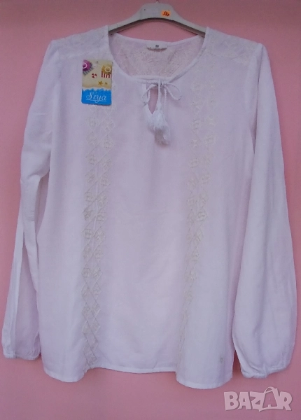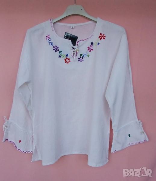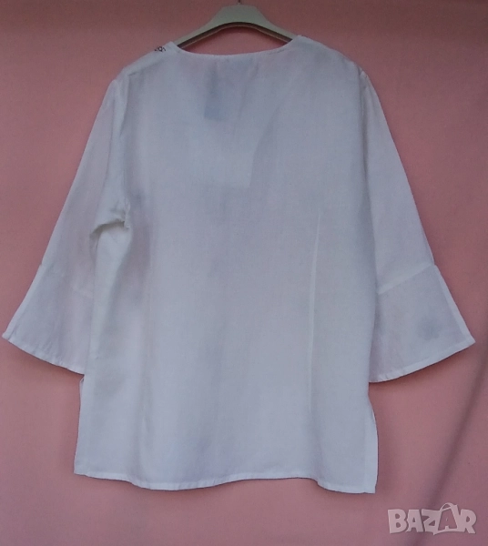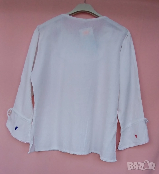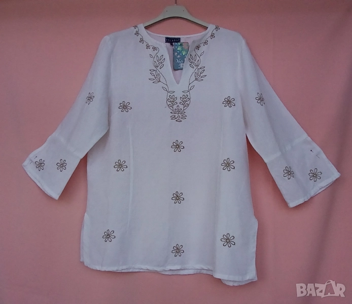 3. Дамска риза памучна с обло деколте и цепка. Предната част и ръкавите блузата са бродирани с кафяви цветя и бели мъниста за ефект. Размер 42. Марка Еncadee. Обиколка на гърдите 104 см, дължина на ризата 69 см. Цена 25 лв.