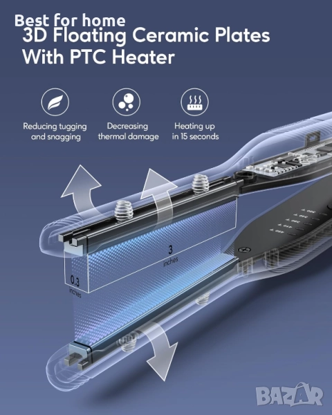 Технология за стабилно нагряване: дължината ѝ е 31 см и теглото 0,52 фунта. Тази мини преса за изправяне е оборудвана с керамична плоча, PTC нагревател, който ѝ позволява да достигне предварително зададената температура в рамките на 15 секунди и осигурява постоянна температура, за да се сведе до минимум увреждането на косата или брадата от топлина.